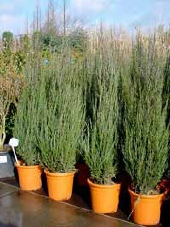 Eigenschaften: Der Juniperus scopulorum 'Skyrocket' (Raketen-Wacholder) gilt als sehr frosthart und bietet mit der Sorte 'Blue Arrow' eine winterharte Alternative zu den beliebten Toscana-Zypressen. Auch hier kann der Wacholder sowohl als Solitärelement aber auch in der Gruppe als individuelles Gestaltungselement genutzt werden..