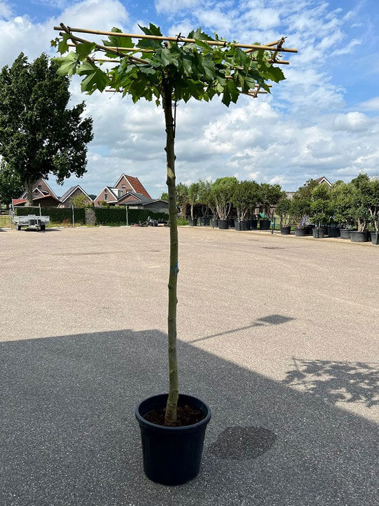 Platanus acerifolia 'Dachform / Sternform / Dachspalier' (Dach-Platane/Schirmplatane) im Topf, Stamm mit flacher Kronenform