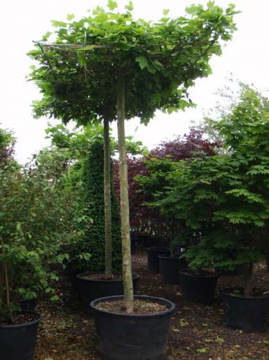 Platanus acerifolia, Dach-Platane in Dachform/Sternform als Schirmplatane, Hochstamm im Container mit geschnittenem Dachkronenaufbau.