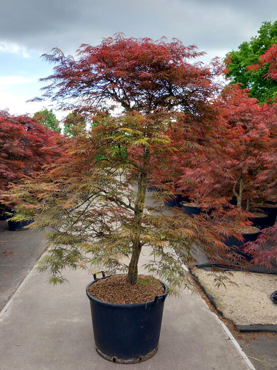 Dunkelroter Schlitz-Ahorn Acer palmatum 'Dissectum Garnet', 200-225 cm im C90-Topf, mehrstämmig mit fein geschlitzten Blättern.