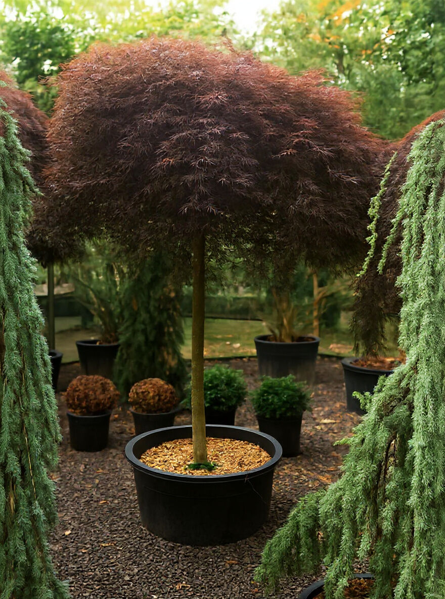 Dunkelroter Schlitz-Ahorn Acer palmatum 'Dissectum Garnet' als Hochstamm im schwarzen Pflanztopf mit feinem, geschlitztem Laub.