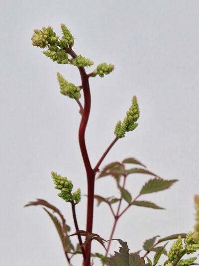| Blüte: | Reinweiß, im Verblühen grünlich, einfach, viele Einzelblüten in Rispen zusammen, federartig aussehend, reichblühend und zierend. |