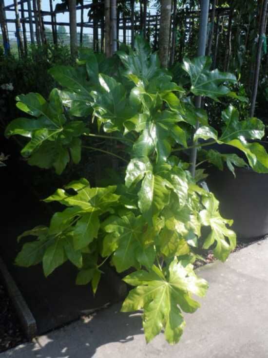 Fatsia japonica (Zimmeraralie) als Topfpflanze mit großen, tief gelappten, dunkelgrünen Blättern im Gewächshaus.