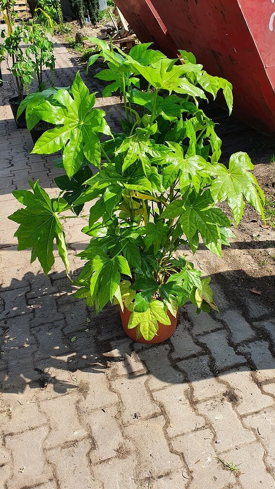 Zimmeraralie (Fatsia japonica) 60–80 cm im C12-Topf, aufrecht wachsend mit großen, glänzenden, gelappten grünen Blättern.