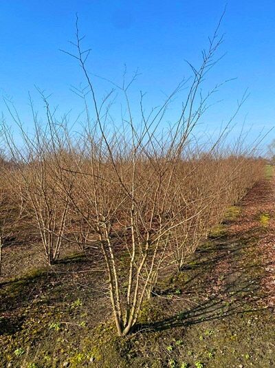 Japanische Zelkove (Zelkova serrata) Keakibaum, mehrstämmig, 200–250 cm, laubfreier Baum mit mehreren Stämmen im Feldbestand.