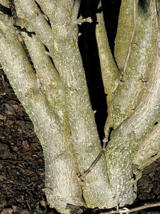 Der Stamm des Strauch-Eibischs ’Pastelrose‘ wirkt robust und dezent. Er präsentiert bei jungen Exemplaren eine leicht behaarte Rinde, die dann zunehmend glatt wird. Die gräuliche Farbgebung der Rinde bildet einen harmonischen Kontrast zu dem frischen Grün des Blatts und macht ihn zu einem attraktiven Gartenstar.